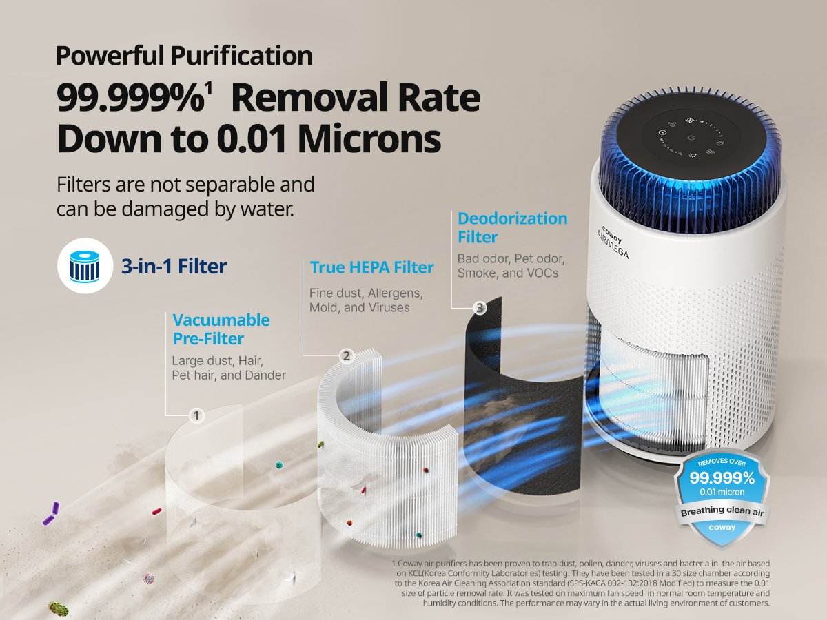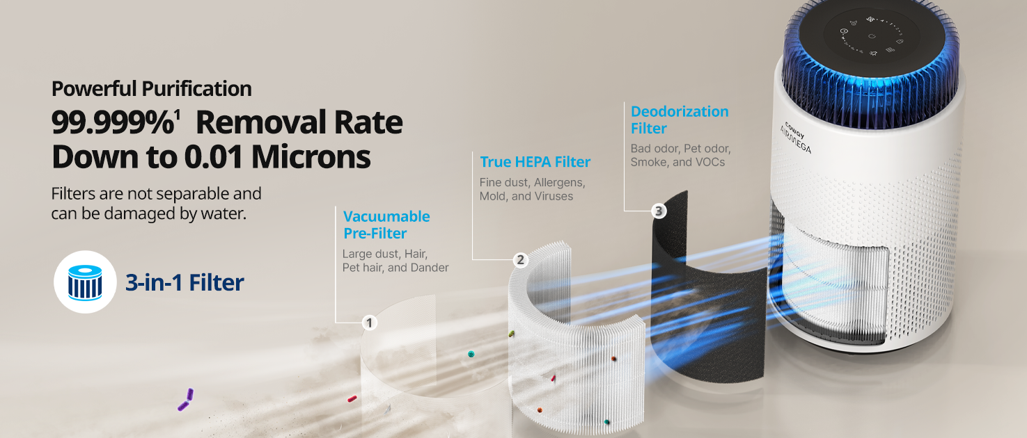 The Airmega 100 filter is a combined Pre-Filter, True HEPA filter, and Deodorization filter, all in one convenient package.