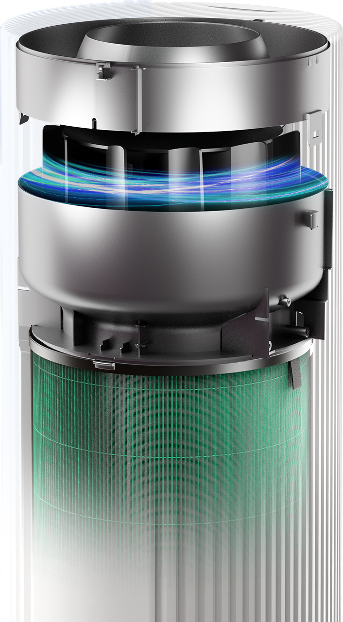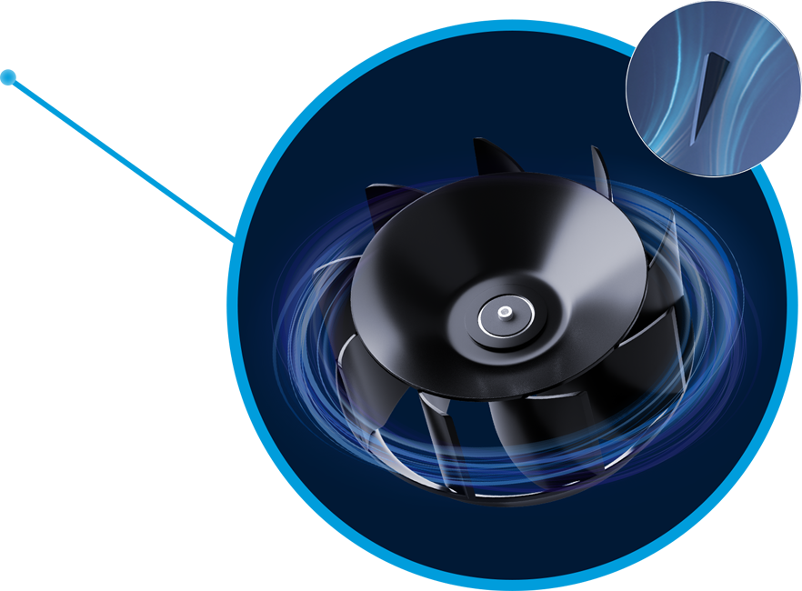 Optimizes airflow while minimizing airflow loss, enhances air purification, and reduces noise levels: ① Eagle Vane Design: Aerodynamic blades inspired by eagle wings create controlled vortices for consistent airflow and optimized performance. Small, rounded protrusions at the base of the fan blades maintain consistent air flow and performance. ② Vortex Generator Fan: Precision-engineered blades maximize airflow, enhancing circulation, and delivering powerful volume. ③ Dimple Duct Technology: Duct holes resembling golf ball dimples reduce air resistance, allowing smoother air intake while minimizing air loss.