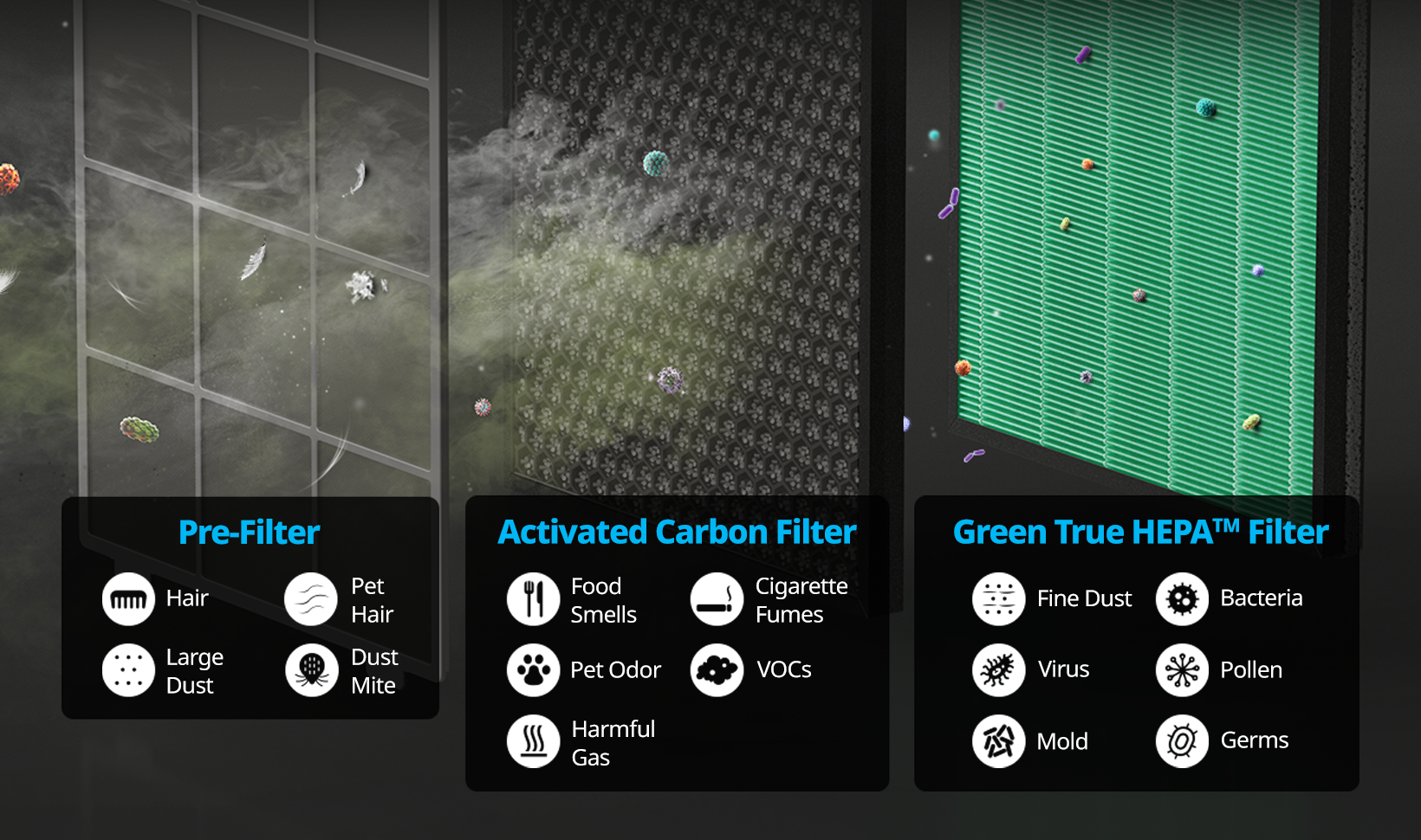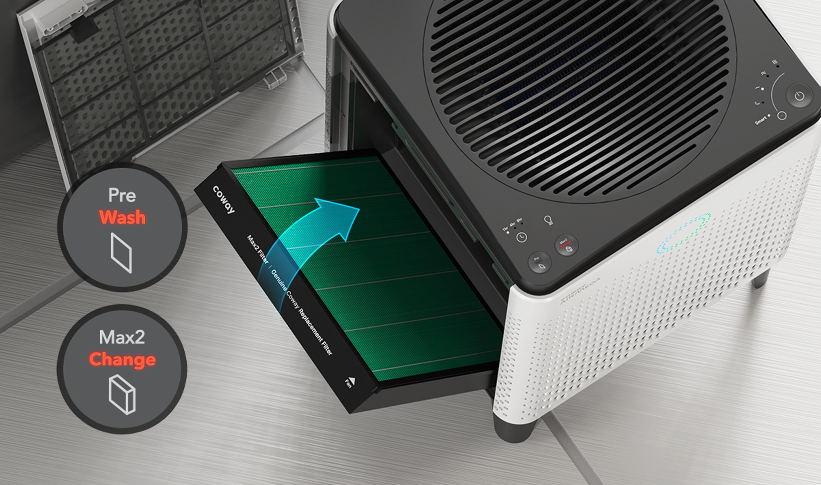 Easy-to-clean pre-filter captures large particles like hair, fur and dust in its micromesh, so Max2 filter can work more effectively.
