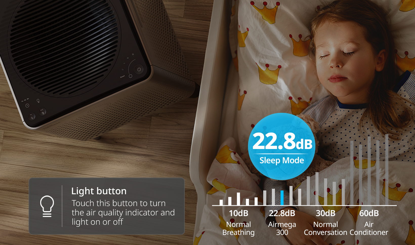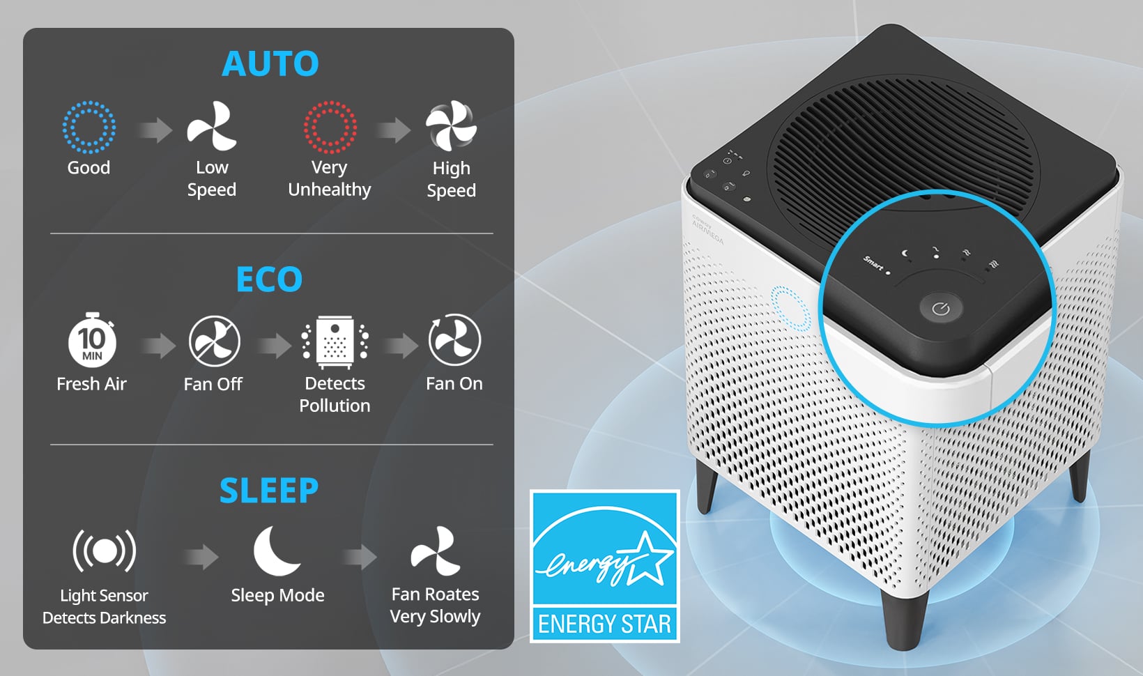 Let Airmega 400 do it all with 3 smart settings, Airmega adapts to every space.