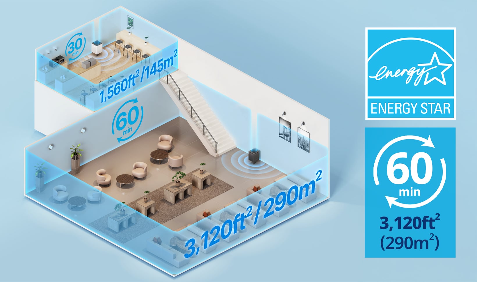 The Airmega 400 air purifier effectively filters the air in rooms up to 2842 ft² in 60 minutes.