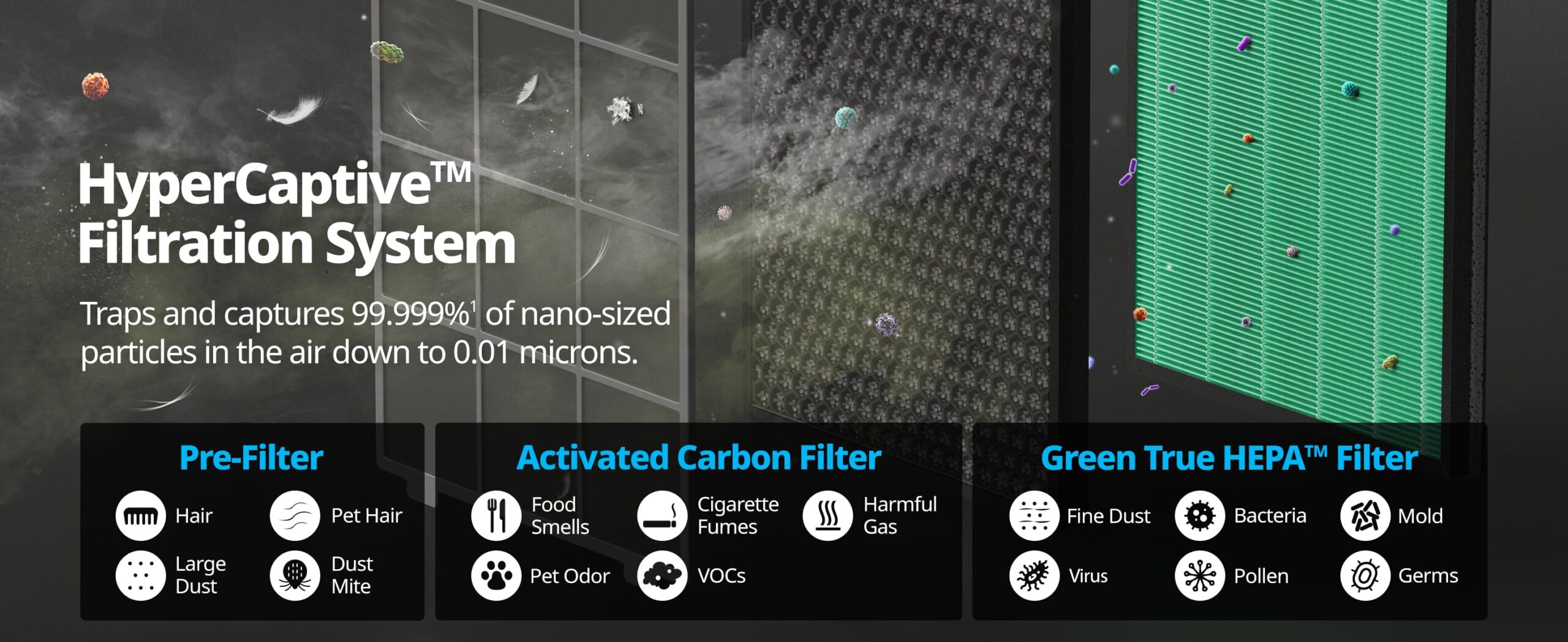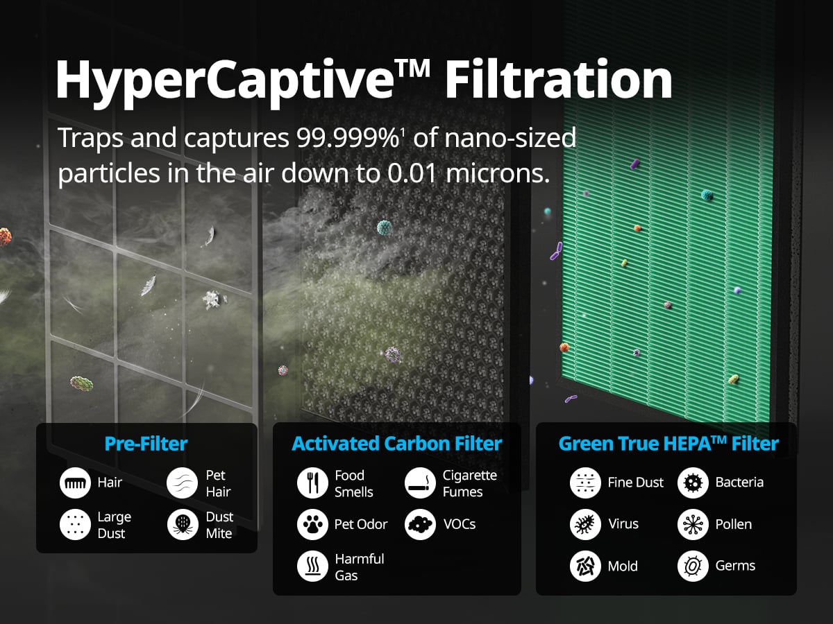 Traps and captures 99.999%¹ of nano-sized particles in the air down to 0.01 microns.